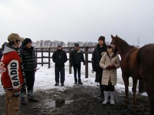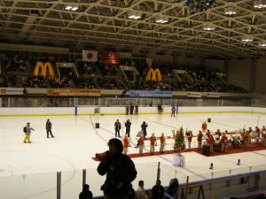 雪の降る中、アイスホッケー場での撮影に好子さんも参加しました